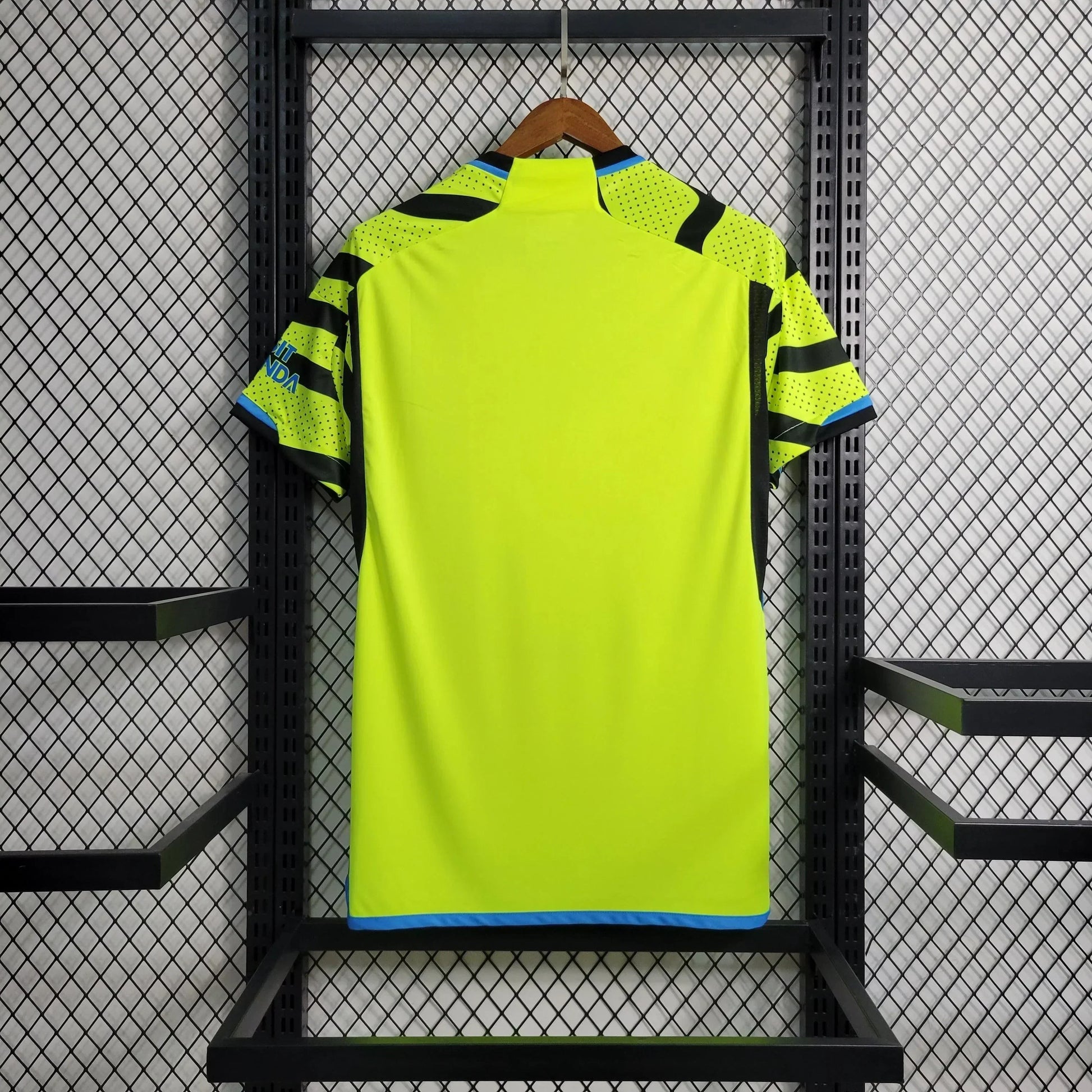 The Arsenal away jersey for the 2023/24 season showcases a vibrant and modern design that reflects the club's rich heritage while embracing contemporary trends. Predominantly featuring a striking yellow hue, this kit is accentuated with bold black detailing, creating a dynamic contrast that captures the essence of Arsenal's adventurous spirit. The jersey is crafted from high-quality, breathable fabric to ensure maximum comfort and performance on the pitch, making it an excellent choice for both players and fans alike.