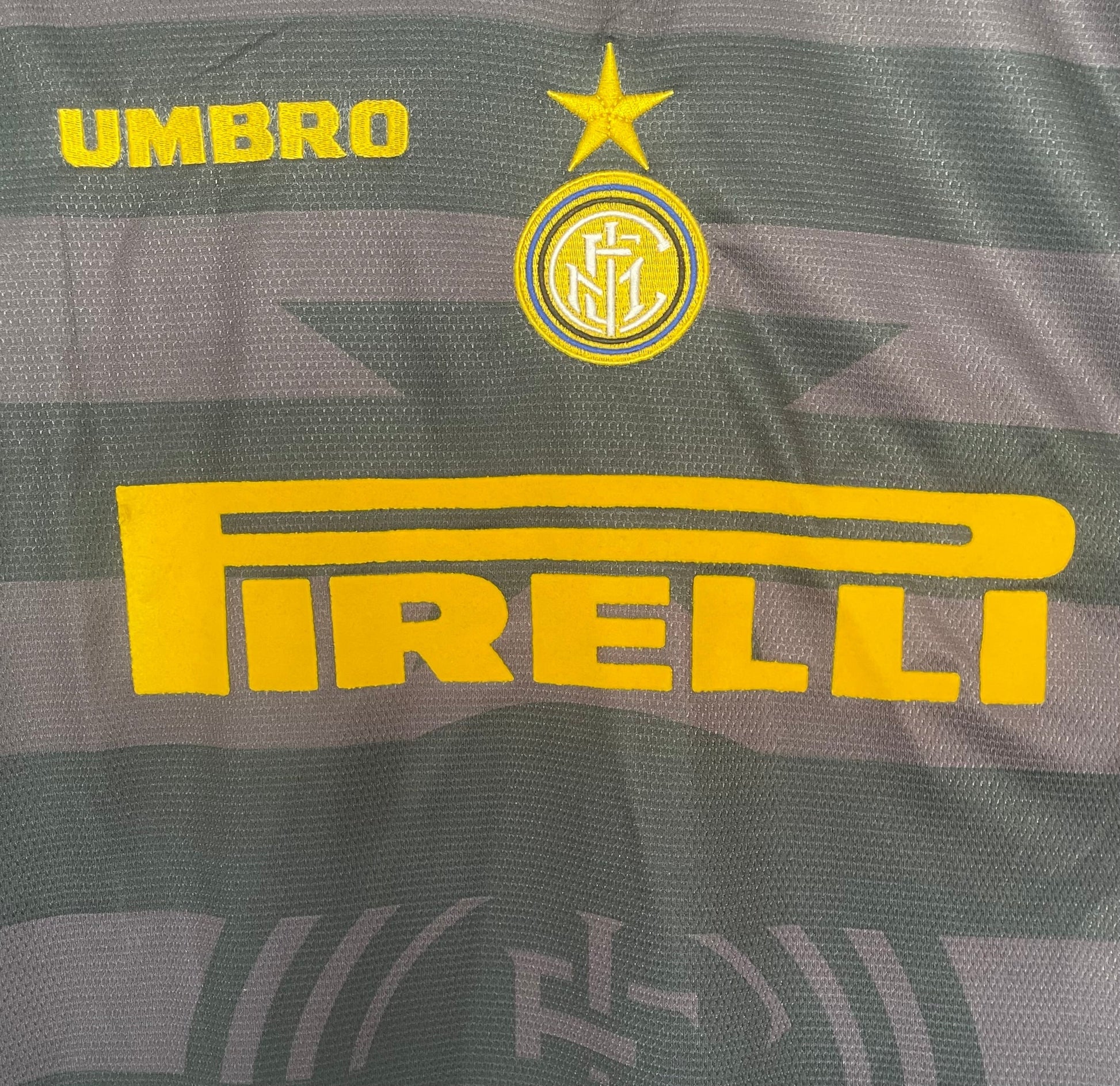 The Inter Milan long sleeve away shirt from the 1997-98 season is one of the club’s most iconic designs, symbolizing a season filled with domestic and European success. Featuring a bold black and grey hooped design with blue accents, this jersey is closely linked to Inter’s triumph in the 1997-98 UEFA Cup.