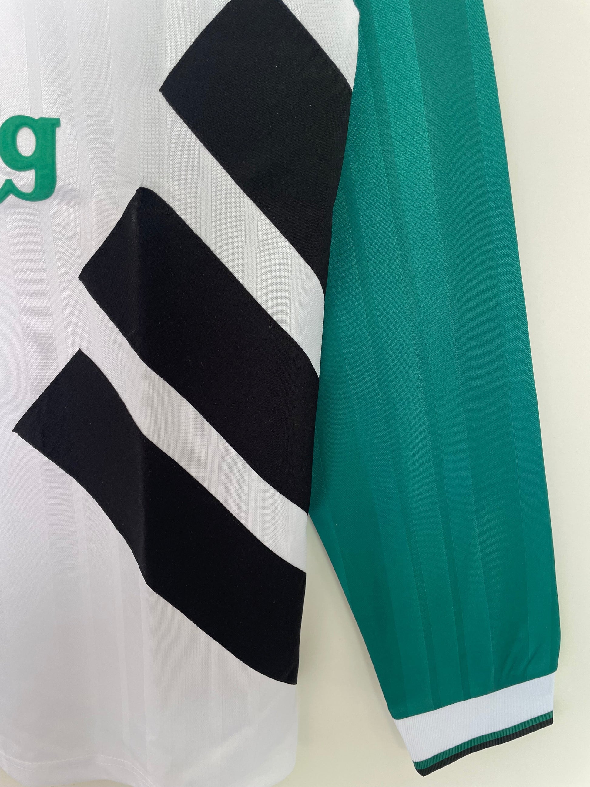 The 1993-1995 Liverpool away shirt is one of the most iconic kits from the early Premier League era. Designed by Adidas, this long-sleeve jersey features a bold white base with oversized black Adidas stripes, contrasted by teal green sleeves and collar detailing. The Carlsberg sponsor is prominently displayed, while the Adidas Equipment logo adds a signature ‘90s touch.