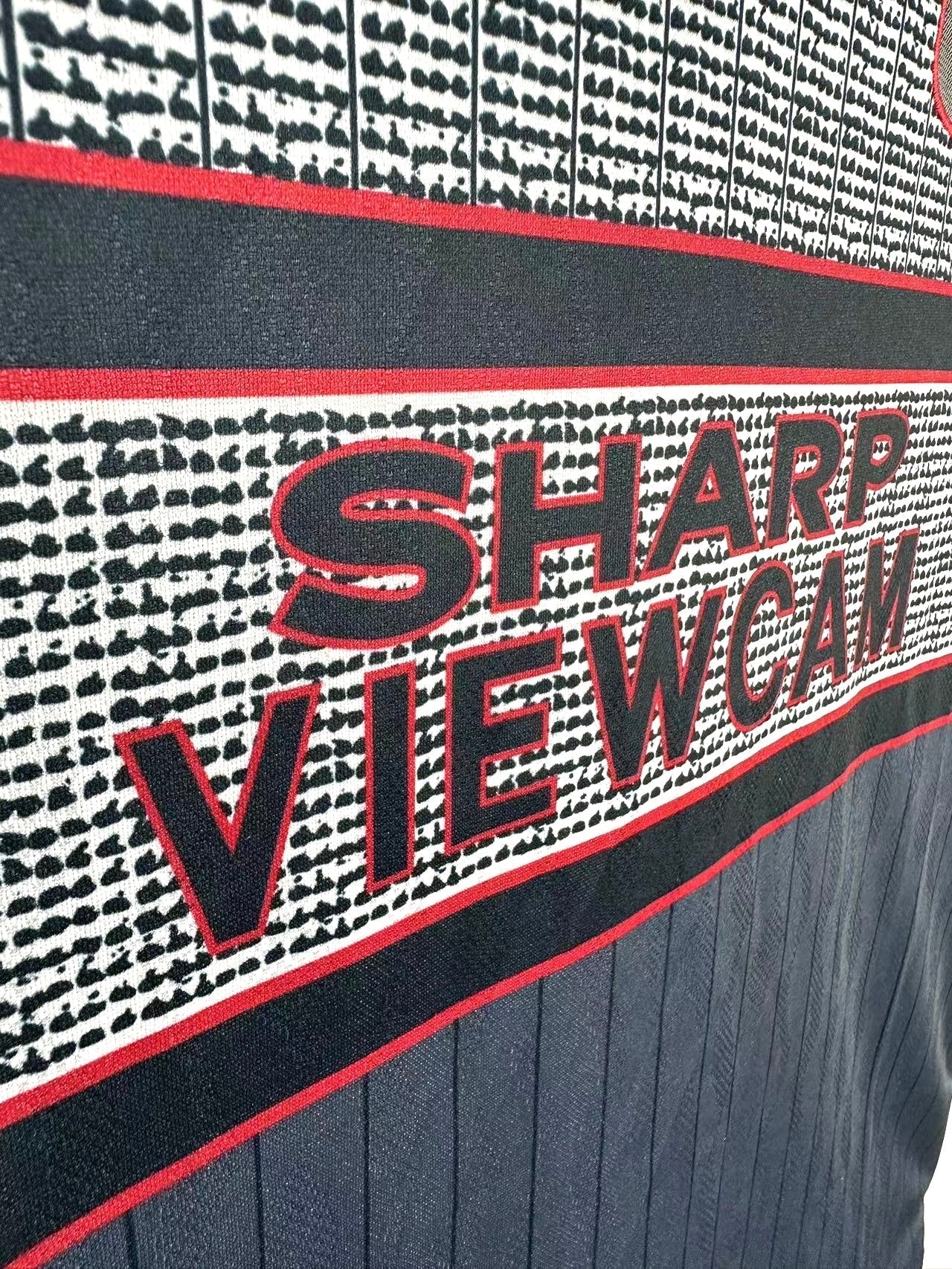 The Manchester United away shirt from the 1995-1996 season, crafted by Umbro, stands out as one of the most memorable kits in football history. This jersey features a distinctive all-grey design, complemented by subtle pinstripes and the classic Sharp Viewcam sponsor emblazoned across the chest. The club's crest and Umbro logo are embroidered, adding a touch of elegance to this unique piece.